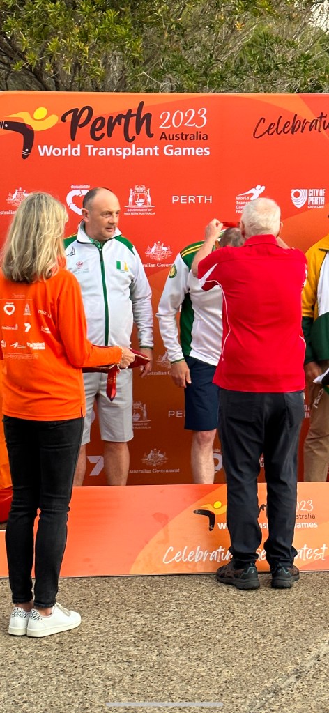 Golfers Dubliner Ron Grainger and Tony Gavigan from Longford, were awarded Silver medals in golf pairs Category 4 (handicap).Ron said “It came as a surprise to us, we played our best all day and had a wonderful game of golf with two South African kidney recipients, so it was great to win the Silver medal.” He went on to add his thanks to his family for supporting him through the good times and the bad, but most of all his kidney donor, saying “just to be here at all, to have the gift of life thanks to someone else’s generosity is phenomenal.” Tony agreed with Ron’s summary, adding that they have been partners in Golf at previous World Games and have always gelled well. He also felt the weather helped, being the first game of golf, they have played in sunny weather for a while! Tony also added his thanks to his son Elden who is living in Christchurch, New Zealand, who spent three weeks coaching him in golf. He said “I felt very optimistic going into the competition thanks to his advice and coaching”. Tony also acknowledged his gratitude to his kidney donor.